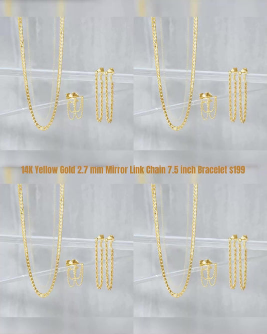 14K Yellow Gold 2.7 mm Mirror Link Chain 7.5 inch Bracelet