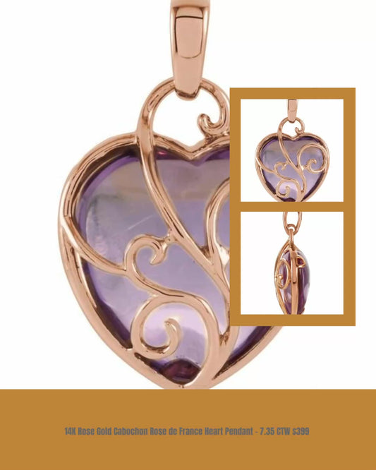 14K Rose Gold Cabochon Rose de France Heart Pendant - 7.35 CTW
